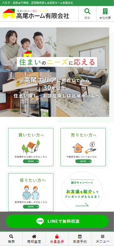 八王子、高尾エリアの地域密着で事業を展開している会社様です。トップページでは売主の独自物件は特集ごとに見せ方を変える事で違いを演出し、建築提案できる強みを施工事例集でアピールできるCMS機能を導入させて頂きました。また賃貸物件は管理物件がメインとの事でしたので、オーナーに対するアピールも含め、賃貸サイトとして独立したサイト構成にさせて頂きました。