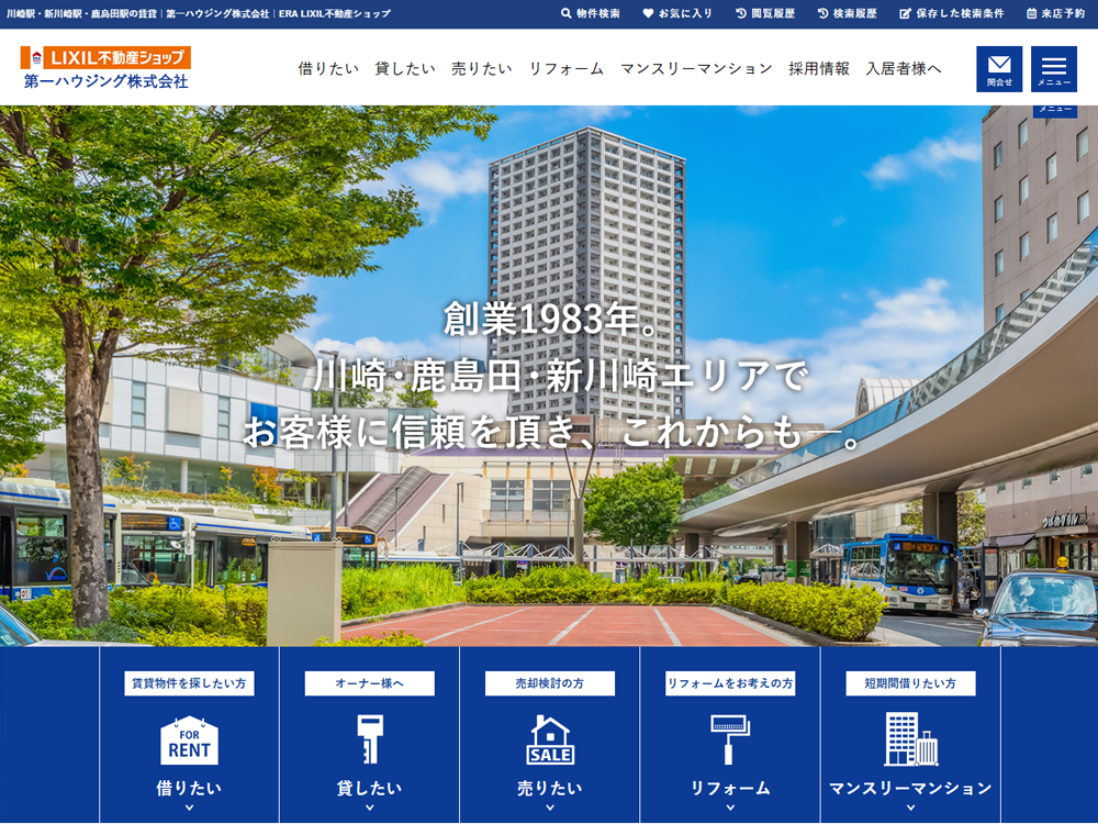 ERA加盟店として川崎西口本店、新川崎鹿島田店の2店舗があり、総合トップページから各店舗ページへの導線にこだわり制作しました。